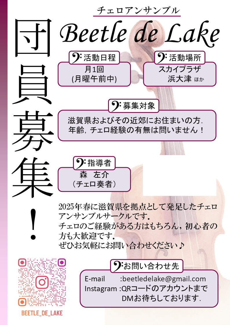 チェロアンサンブル Beetle de Lake は2025年春に滋賀県を拠点として発足したチェロアンサンブルサークルです。